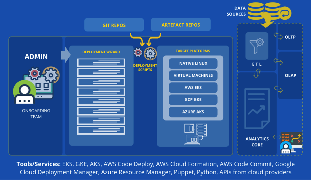 or on docker containers either on-prem or on the cloud infrastructure of the user organization. However, the deployment